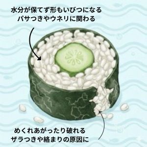 海苔が破れた時にもご飯の水分がなくなってバラバラスカスカになりにくい様に安定させてくれる。