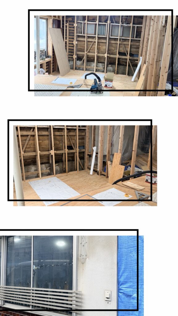 入り口にかかっているブルーシートをが少しめくられていて、その中で作業をしてくださっている職人さん方。